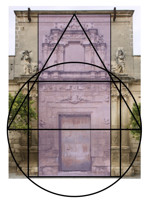 El esquema principal del edificio, que ya comentamos largamente junto con otros edificios de la ciudad en Alquimia en Jerez, es un cuadrado, el cuaternario material, inscrito en un círculo, la perfección de los cielos, que se elevan a quintaesencia por la tríada filosófica. La fachada delimita asimismo un rectángulo de proporción 4:9, la misma proporción que establece entre los 4 personajes alegóricos de los tondos que flanquean la puerta frente a los 9 que decoran el friso.